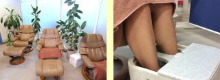 用意が整いましたら、ノルウェー・エコーネス社のゆったりとしたリクライニングチェアに包まれ、41℃前後のフットバスに5分間浸かって頂きます。お湯にエッセンシャルオイルを混ぜ込んだ塩を溶かし、やさしく温めます。温め終えたらいよいよ施術の始まりです。